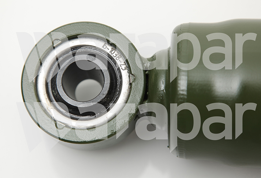 A damper, either frictional or hydraulic, designed to dampen the shock of suddenly applied force and/or to control spring rebound and oscillation, usually attached to the vehicle frame, body or hull and connected to an axle, spring, spring support web or pad or between suspension arms of track-laying vehicles. See also MOUNT, RESILIENT and SHOCK ABSORBER, LEVER ACTION.